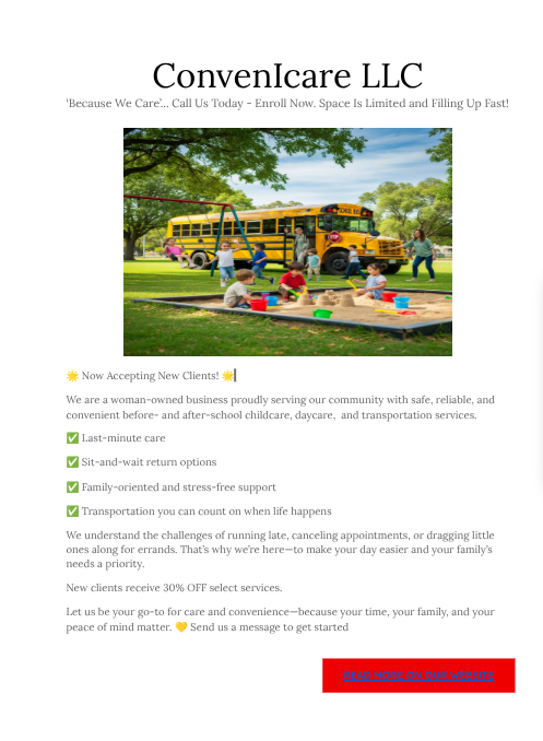 ConvenIcare LLC is proud to offer tailored childcare and transportation solutions designed to meet the unique needs of busy families and working parents.